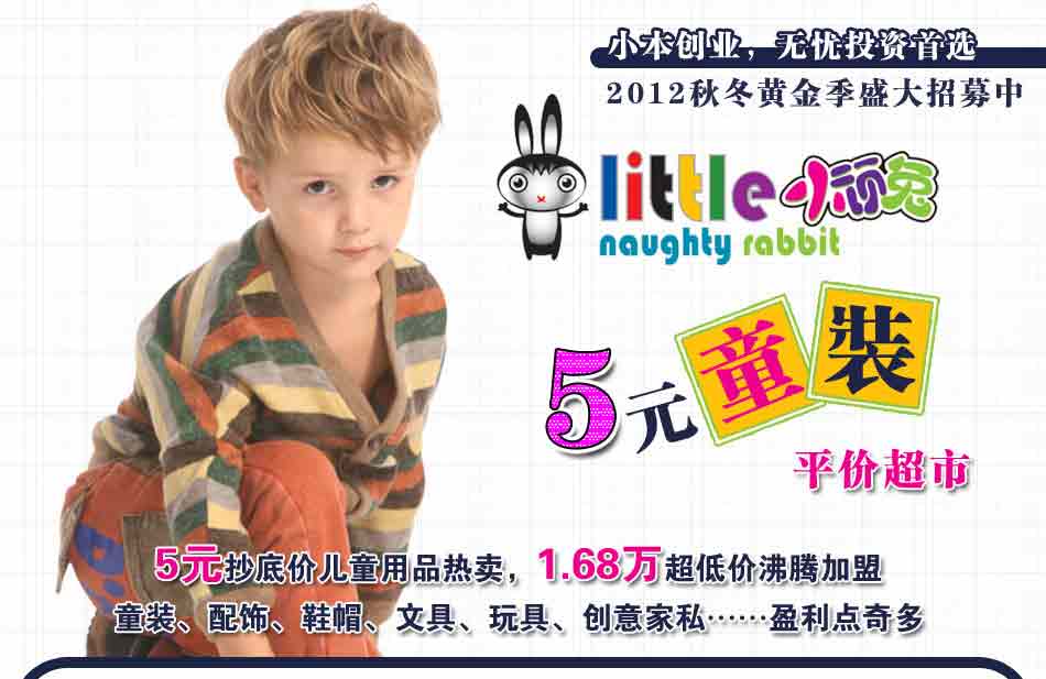 要投資小頑兔5元童裝平價(jià)超市,僅需1.68萬(wàn),5-10平米面積,其它的全部交給我們!