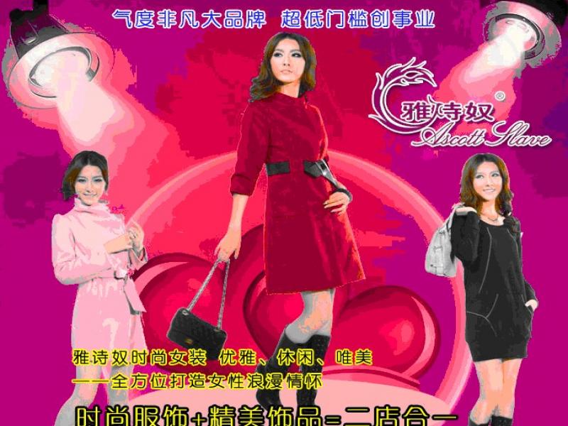介紹:雅詩奴服飾有限公司乃集設(shè)計(jì)開發(fā)、OEM生產(chǎn)、銷售于一體的專業(yè)女裝服飾企業(yè)。公司自2005年創(chuàng)立以來,歷經(jīng)4年的風(fēng)雨磨礪,在激烈的市場競爭中脫穎而出,雅詩奴已經(jīng)成為中國女裝服飾的知名品牌。回首過去,雅詩奴經(jīng)歷了傳奇般的跨越式發(fā)展,一年一小變,三年一大變。公司專營時(shí)尚女裝服飾,包括潮流女裝、配飾及包包。公司擁有優(yōu)秀的設(shè)計(jì)師團(tuán)隊(duì)、先進(jìn)的管理模式以及專業(yè)的營銷隊(duì)伍,在追求產(chǎn)品種類多元化、單一品種精致化的同時(shí),公司采用多樣化的經(jīng)營方式,主要分為專賣經(jīng)銷商以及品牌代理商。