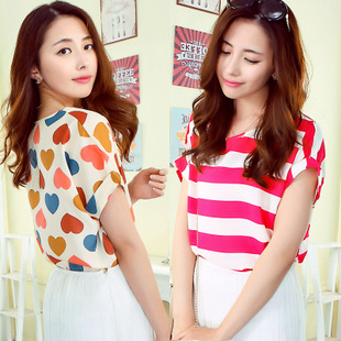 韓版時(shí)尚個(gè)性性感寬松印花雪紡衫 女式雪紡短袖蝙蝠袖雪紡T恤A039 /