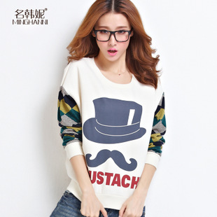 2014秋冬新款圓領衛(wèi)衣女休閑長袖印花胡子純棉抓絨套頭寬松外套 /