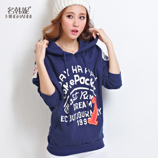 2014冬季新款女裝韓版寬松連帽衛(wèi)衣休閑長袖字母 貼布套頭外套 /