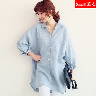 • A0004秋季新款亞麻女裝胖mm秋裝飄逸寬松中長款大碼襯衣長袖襯衫 /