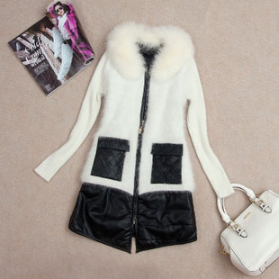 歐美秋季新款 長款拼接PU皮假兩件女士貂絨大衣 毛衣外套女款1378 /