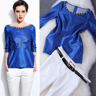 【雙12推薦】歐美2014早秋季新款 藍(lán)白訂珠休閑套裝 8625配腰帶 /