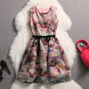 歐洲站 2014春夏裝新款歐美明星走秀真絲歐根紗印花女裝連衣裙 /