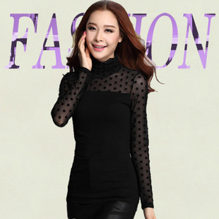 • 新款大碼女裝2014秋裝新款修身韓版波點高領(lǐng)網(wǎng)紗打底衫胖MM衫代理 /