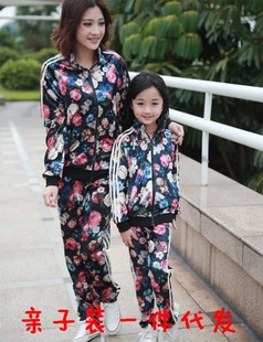 韓版秋款一件代發(fā) 親子裝黑色碎花長(zhǎng)袖拉鏈親子運(yùn)動(dòng)套裝母女裝 /