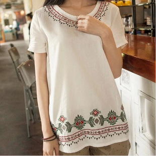 192# 日系森女系文藝短袖寬松原創(chuàng)民族刺繡瑪雅白色棉麻上衣t恤 /