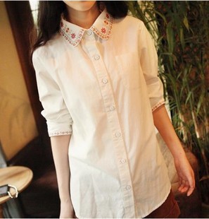 520#日單森系文藝范花朵刺繡小翻領(lǐng)純棉長(zhǎng)袖白色襯衫百搭打底衫 /