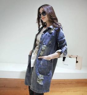 2014 春裝新款牛仔外套 女 中長(zhǎng)款 韓版寬松破洞牛仔衣 潮 /
