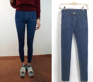 韓國(guó)代購(gòu)秋季新款女高腰顯瘦雙扣小腳褲牛仔褲鉛筆褲九分褲 女裝 /