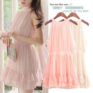 (杏M到貨)夏粉色甜美范荷葉邊高腰掛脖飄逸雪紡綁帶露肩連衣裙 /
