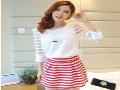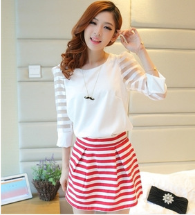 女裝歐根紗條紋拼接七分袖雪紡衫上衣+條紋蓬蓬裙套裝(雙款) /