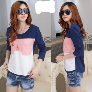 韓版秋裝2014新款女式打底衫 撞色拼布圓領套頭長袖T恤 88047 /
