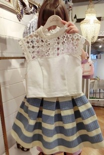 韓國代購東大門蕾絲拼接鏤空上衣條紋短裙連衣裙 兩件套套裝女 /