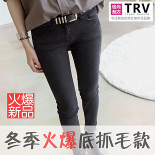 2014冬季新款女裝韓版牛仔褲女 抓絨修身保暖小腳褲低腰 一件代發(fā) /