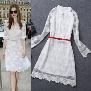 歐洲站2014秋冬新款女裝白網(wǎng)布繡花立領長袖連衣裙送腰帶一件代發(fā) /