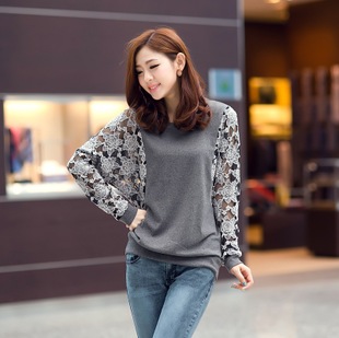 韓版2014秋裝新款大碼女裝蝙蝠袖蕾絲拼接長袖T恤打底一件代發(fā) /