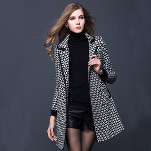 歐美時尚千鳥格毛呢外套一件代發(fā)歐洲站中長款雙排扣大衣女裝 /