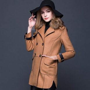 歐洲站冬季長款外套一件代發(fā)歐美時尚雙排扣毛呢大衣女裝 /