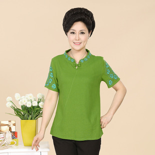 2014夏季中老年女裝短袖T恤時(shí)尚大碼媽媽裝純色繡花棉麻寬松上衣 /