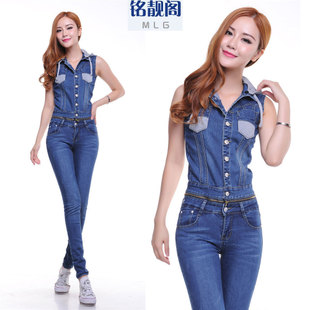直銷韓版修身顯瘦牛仔連衣褲連帽子連體套裝可拆卸女裝牛仔小腳褲 /
