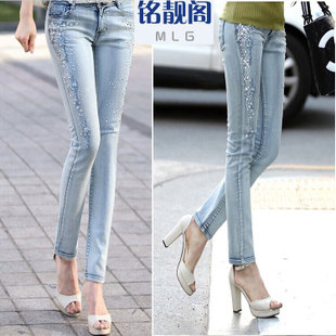 新款韓版潮高燙鉆牛仔褲女式顯瘦修身提臀小腳褲女褲女士長褲子 /