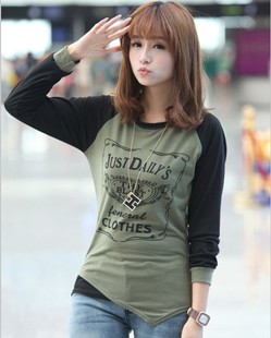 實拍 韓版上衣印花字母拼接圓領(lǐng)長袖t恤女款修身大碼打底衫 /