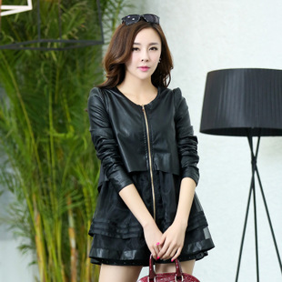 爆款秋裝女裝風衣 韓版荷葉邊網(wǎng)紗拼接PU皮外套風衣 純色衣戀9907 /