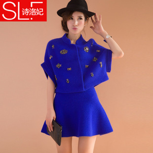 新款2014秋冬歐美新款 貂絨毛衣女士套裝 貂絨開衫外套短裙兩件套 /