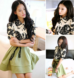 2014秋季韓版女裝 爆款連衣裙 水墨印玫瑰花中袖連衣裙 /