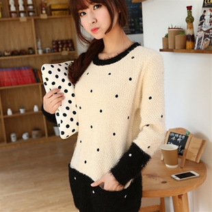 韓國代購2014秋冬裝新款中長款海馬毛波點(diǎn)口袋寬松打底毛衣女批發(fā) /