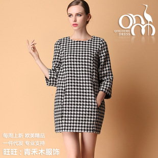 2014春裝新款歐美時(shí)尚千鳥格微喇分袖繭型深圳女裝連衣裙 /