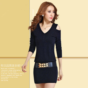 2014秋季新款女針織V領(lǐng)韓版包臀修身露肩性感夜店長(zhǎng)袖打底連衣裙 /