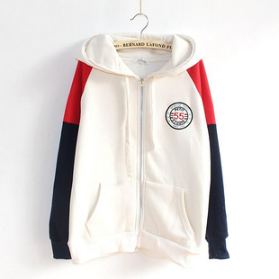 青島即墨秋冬外貿(mào)新款韓版休閑刺繡徽章大碼衛(wèi)衣 連帽拼色拉鏈抓絨外套女 /