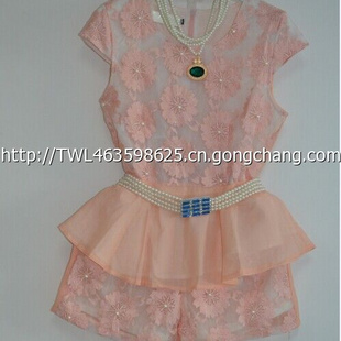 歐洲站2014夏裝新款 優(yōu)雅荷葉邊水溶花套裝女時尚修身娃娃裝 /