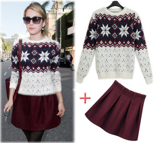 歐洲站2014秋冬裝新款 北歐風(fēng)馬海毛套頭毛衣+毛呢短裙套裝優(yōu)質(zhì)版 /