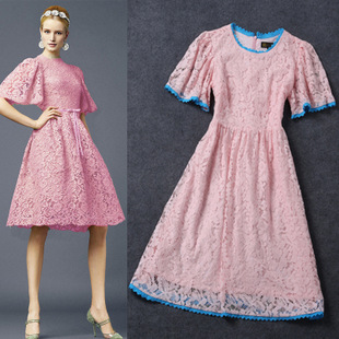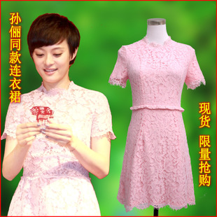 2014歐美高端明星孫儷同款粉色蕾絲花邊立領(lǐng)泡泡袖中長(zhǎng)連衣裙 /
