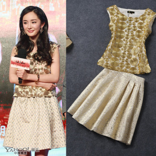 女裝 夏裝 新款2013小時(shí)代同款楊冪明星 無(wú)袖繡花金絲連衣裙套裝 /