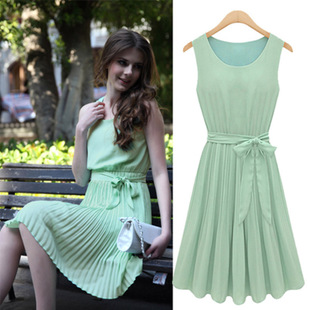 2014夏季新款歐美風無袖百褶背心裙 雪紡圓領(lǐng)連衣裙子 /