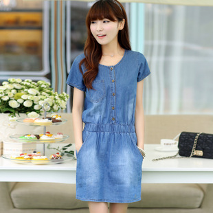 唯蒔 韓版2014韓國短袖夏季連衣裙 大碼女裝胖牛仔連衣裙 /