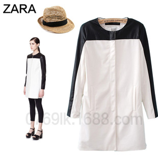 【淘貨源】2014春裝新款ZARA歐美風(fēng)黑白拼接皮衣顯瘦風(fēng)衣外套大衣 /