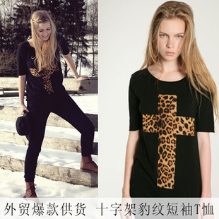 【淘貨源】俄羅斯外貿(mào)女裝代購 豹紋十字架拼接短袖圓領(lǐng)t恤批發(fā) /