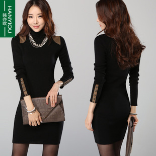 韓亦歐 2014冬季打底加厚毛衣裙 韓版修身高領(lǐng)中長款修身彈力毛衣 /