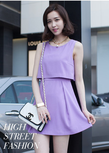 2014新款夏季ol小香風(fēng)假兩件女修身收腰紫色裙子女 無袖連衣裙 /