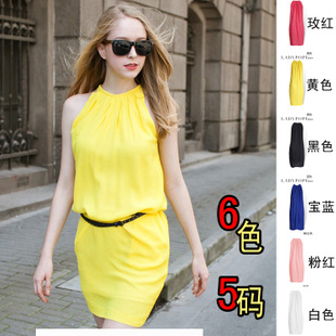 2014歐美糖果色背心裙 無(wú)袖雪紡連衣裙 掛脖打底雪紡(送圖腰帶) /