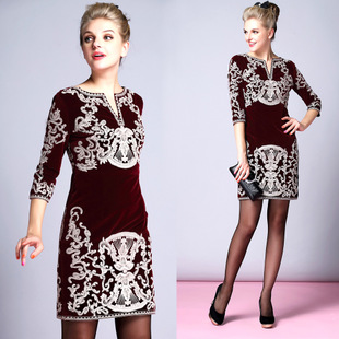 愛焱 2014秋冬款長袖連衣裙 絲絨繡花 歐洲站歐美風(fēng)獨(dú)創(chuàng)設(shè)計(jì)生產(chǎn) /