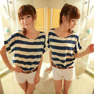 2014夏季新款韓版女裝雪紡衫短袖上衣條紋t恤女#239 /