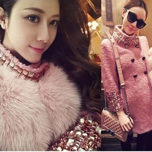 2014秋冬新款 小香風(fēng)重工釘鉆大衣中長(zhǎng)款風(fēng)衣修身羊毛呢外套 /