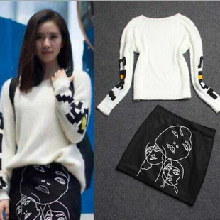 韓國(guó)代購 2014秋季新款 白色海馬毛上衣+黑色呢子短裙兩件套 /